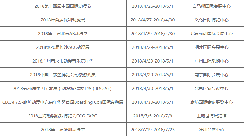 下面為您介紹2018年動(dòng)漫展展會(huì)排期。