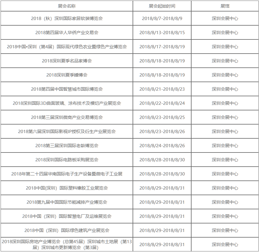 下面為您介紹2018年8月深圳展會(huì)排期。